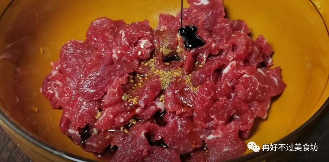 3、将牛肉抓拌至粘手,再加入少许的食用油,锁住水分,抓匀后,将它腌制15分钟。