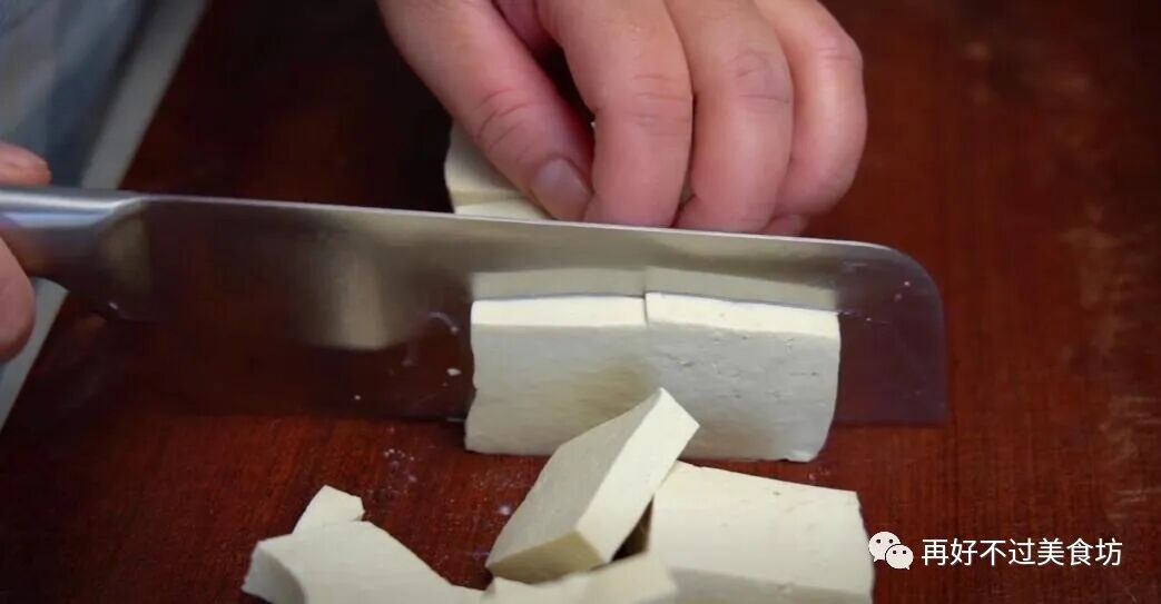 7、一块老豆腐切成厚一点的片,都装入盘中备用。
