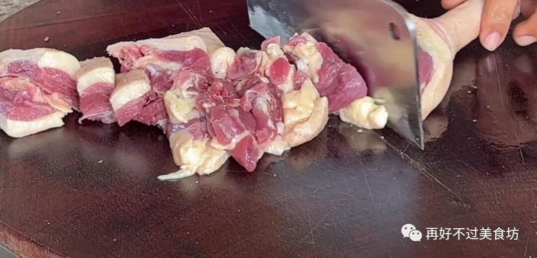 1、将买回来的鹅肉清洗干净,用刀利落斩成小块,之后放盆里留着备用。