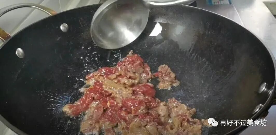 6、锅中油烧热后,先来炒牛肉,牛肉下锅后,用炒勺迅速地将牛肉划散,牛肉炒制的时间不要过长,全部变色后,就先盛出控油备用。