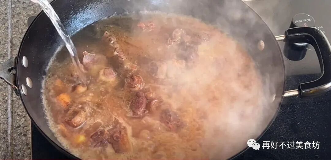 6、炒香后加入适量的开水,等水煮开之后,再加一点冰糖进去,中和一下酱香味,盖上锅盖焖40分钟,比较嫩的鹅,焖25分钟就可以了。