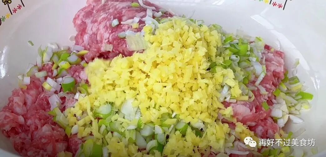 4、再准备一颗大葱,将其切成葱花,再把准备好的老姜切成片,然后切成姜末,切好后,一起倒在肉馅上。
