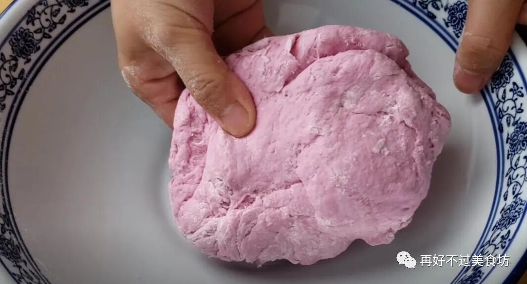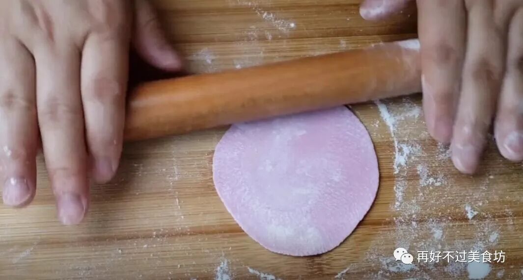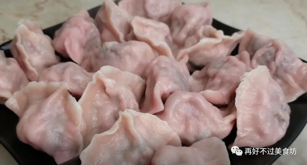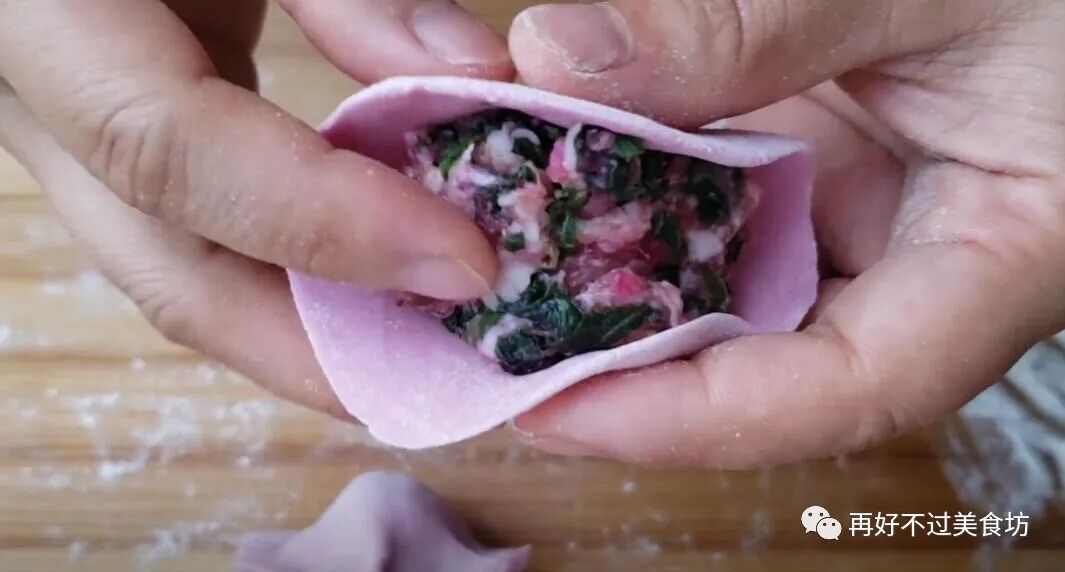 11、随后将调好的肉馅,用面皮给包起来,做成一个个漂亮的紫色饺子。
