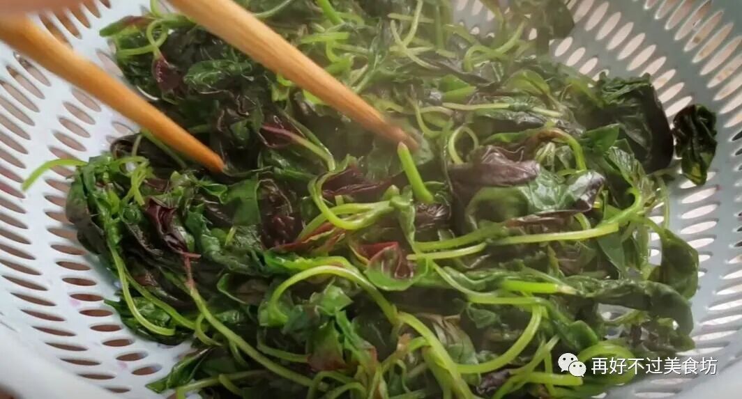 2、放进开水锅里煮大概一分钟左右,然后给它捞出,放进菜篓里面,用筷子将它拨散,稍微放凉。