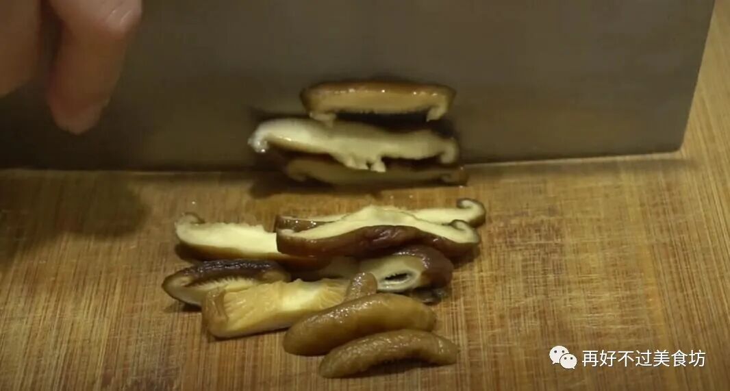 4、香菇用力挤一下水分,放在案板上切成条,切好以后盛到盘子里备用。