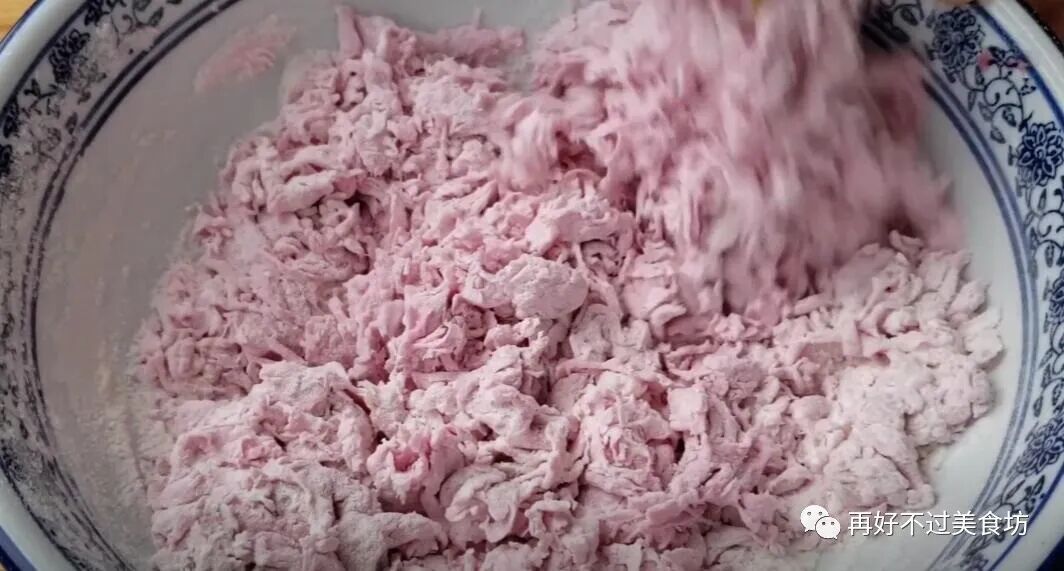 7、在苋菜汁里面加入一点食盐,再加上一点食用碱,搅拌均匀,按照1 : 2的比例加入普通面粉,用筷子搅拌一下,搅成棉絮状。