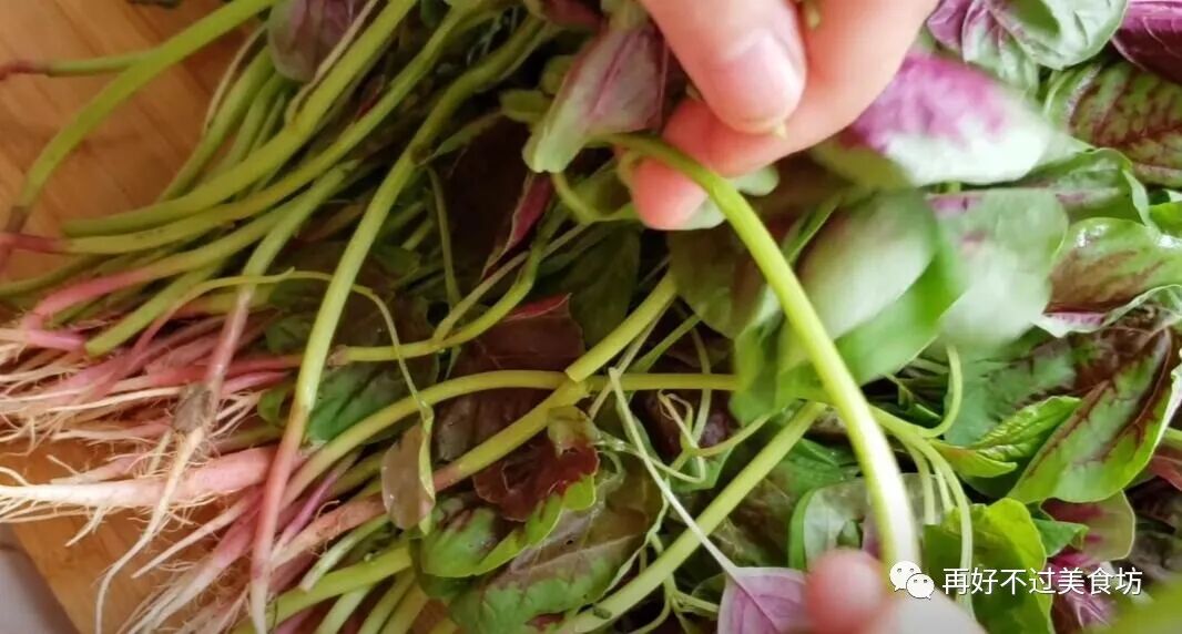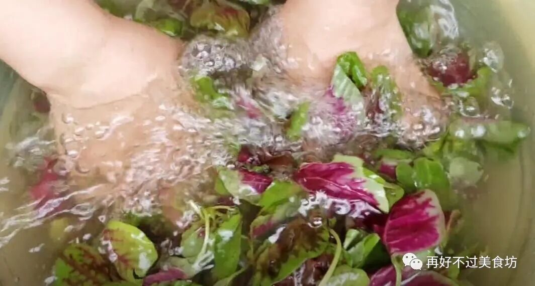 1、准备一把红苋菜,根茎部分不要,只要叶子,将它放在清水里面多抓洗两遍,洗去表面的杂质和泥沙。