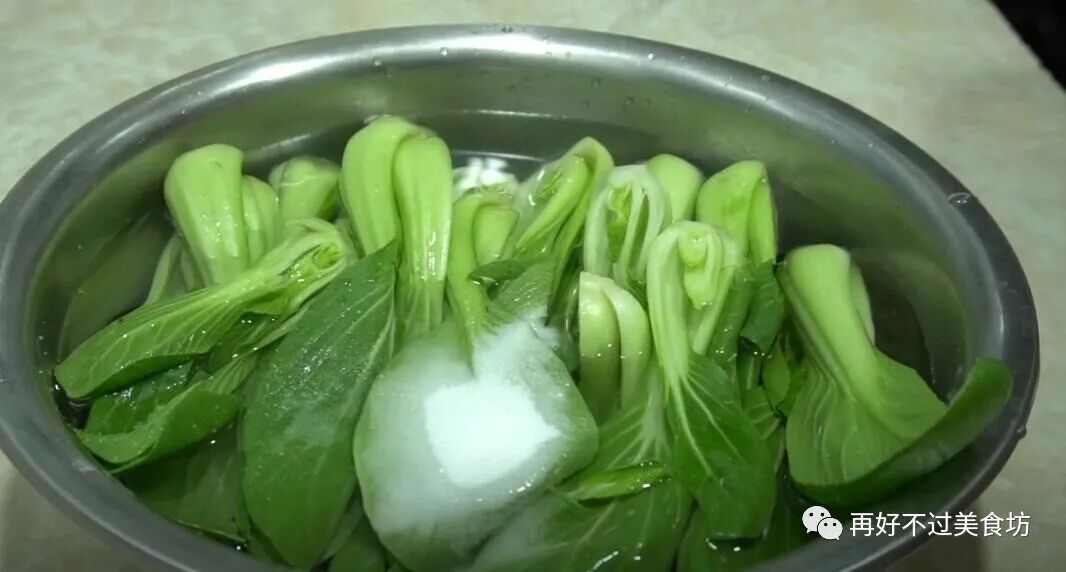 2、加入足量的清水,一小勺盐和一点小苏打,把油菜浸泡个五分钟左右,这样有很好的杀菌消毒和去除残留农药的作用。