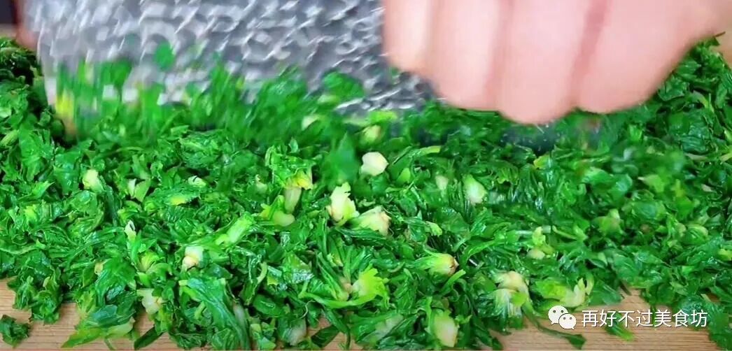 9、再接着把荠菜捞出来,挤干水分,先把荠菜切得碎一些,因为野生的荠菜比较柴,不够水灵,如果切太大很容易塞牙。
