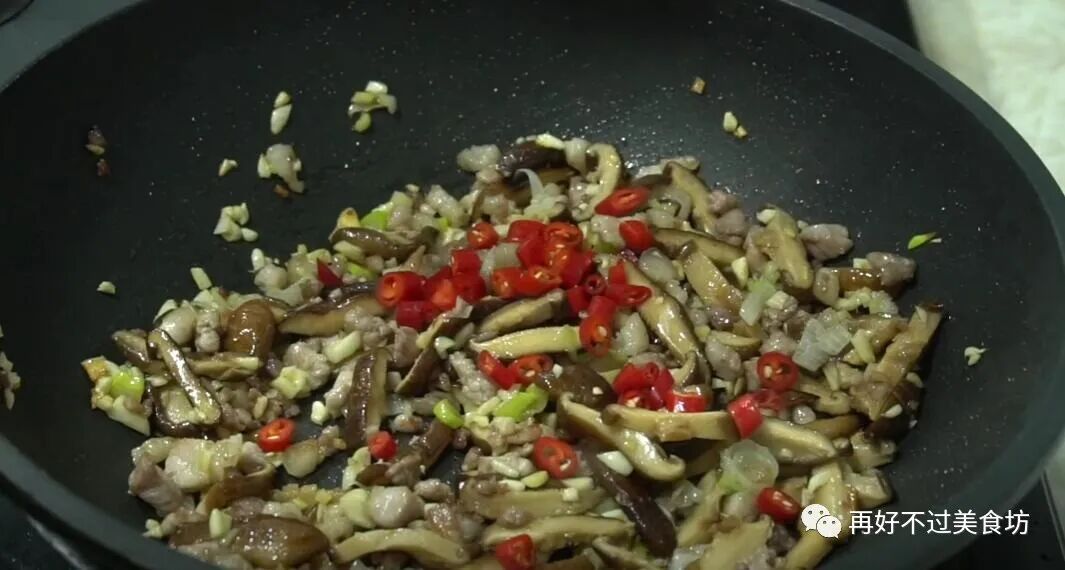 10、紧接着再倒入切好的香菇,先把香菇中火翻炒个一分钟左右,再放上切好的红椒圈简单翻炒几下以后,倒入刚才调好的料汁,转大火把料汁烧开。