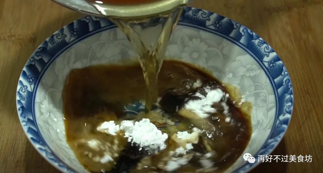 8、碗里加入胡椒粉,适量的盐,一勺生抽,半勺老抽调色,一勺蚝油,一勺料酒,再来一勺红薯淀粉,再倒入小半碗泡香菇的水,把料汁充分搅拌均匀备用。