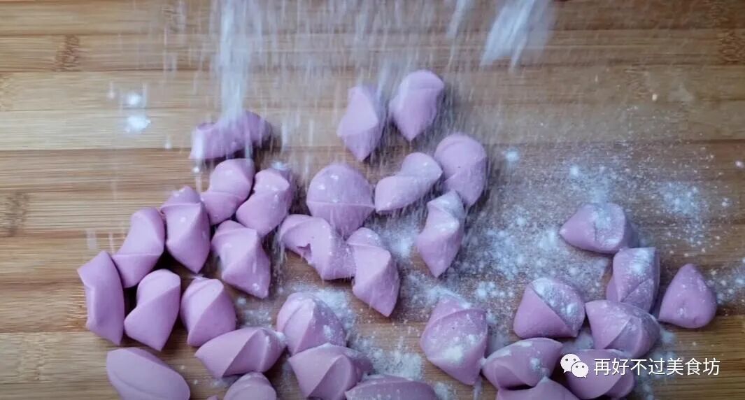 9、切好之后,撒上一点干面粉,将它抖散,再给它搓圆按扁。