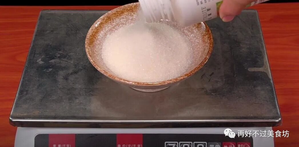 5、下面准备一个碗,加入300克白砂糖,山楂和糖的比例为2 : 1,也就是600克山楂300克白糖,这个比例大家一定要记好。