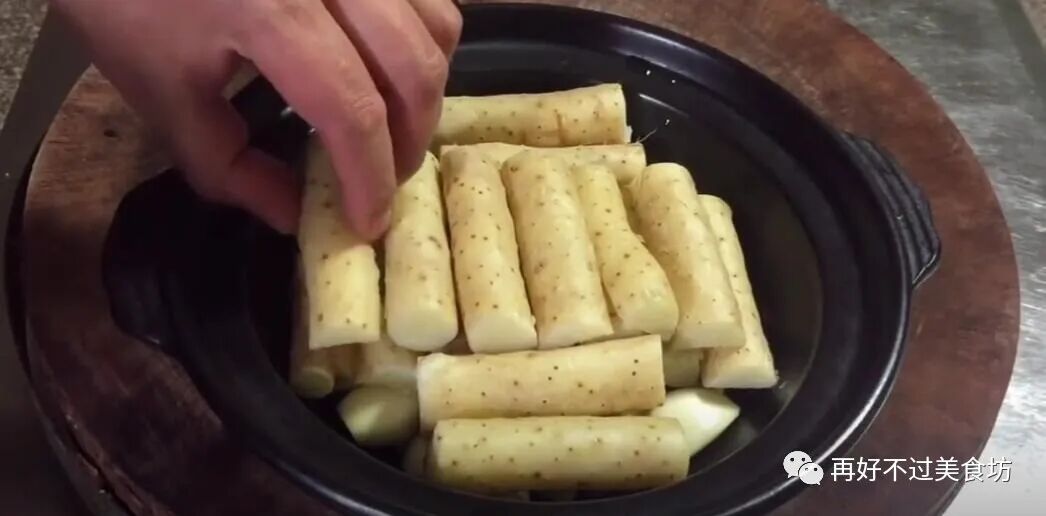 7、准备一个黑色砂锅,倒入200克的大蒜,摆上提前切好的铁棍山药,尽量铺得平一点,再给上面叠加一层,这样看上去会更加饱满。