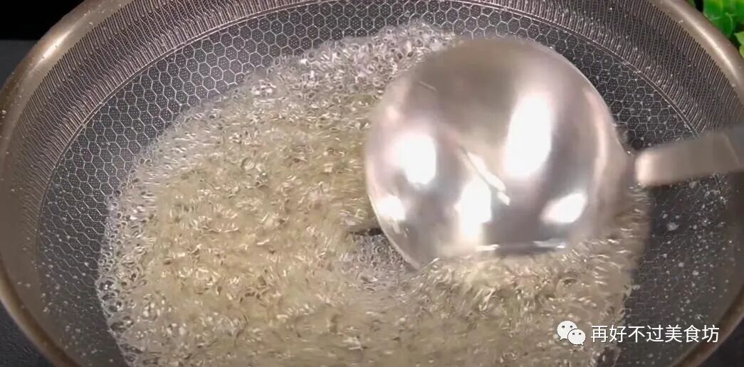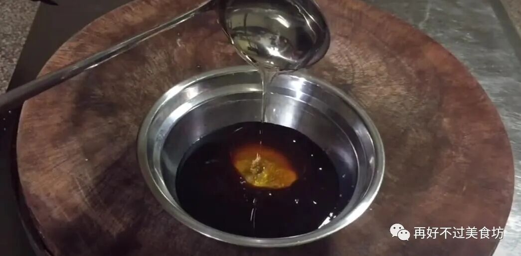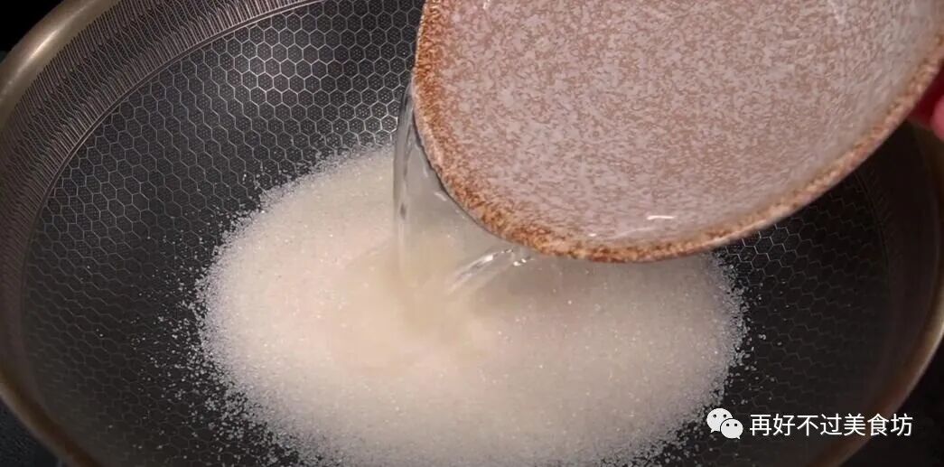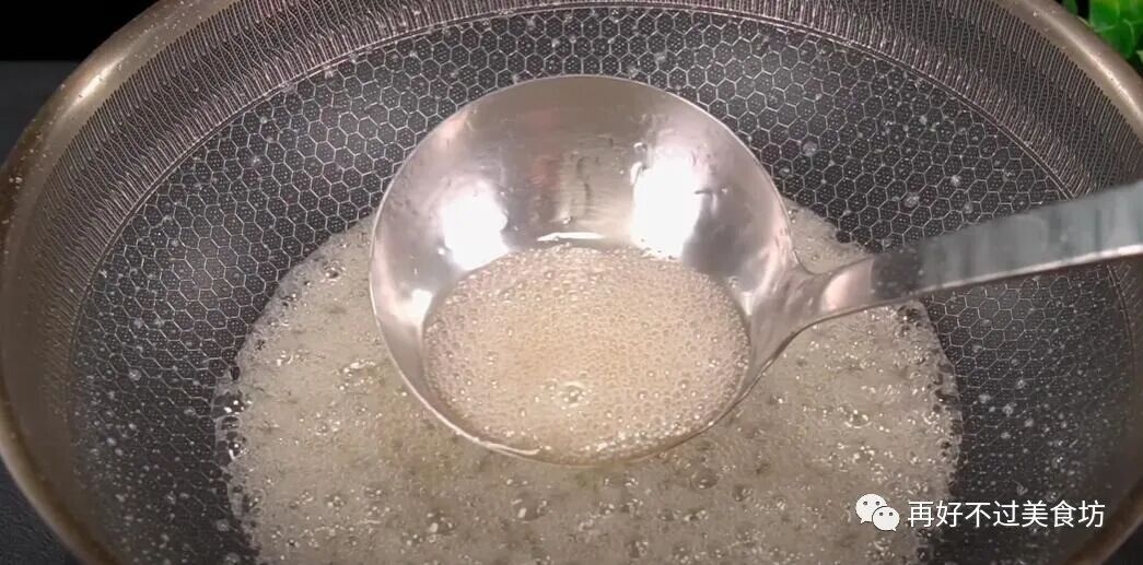 9、最后看到有密集的小泡,并且这个糖水比较的浓稠,表面微微的发黄,这个阶段就叫做挂霜,这时候立马关火,如果再熬下去就变成拔丝了。