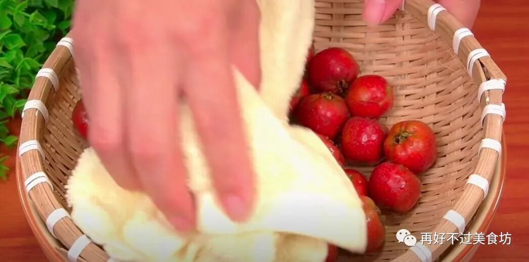 4、山楂清洗干净后,捞起来放在一个竹筐中,用一张干净的毛巾,把山楂表面的水分擦干,这样炒出来表面的糖不容易化掉,也可以用电风扇把它吹干。