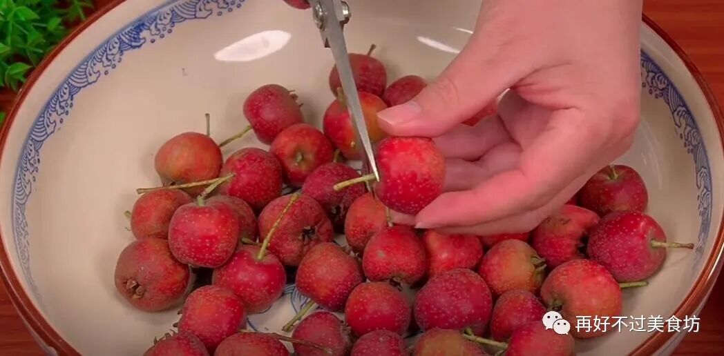 2、下面把山楂处理一下,用剪刀把这个山楂梗剪掉,有花瓣的地方也要剪一下,这样做起来外观更加的好看。