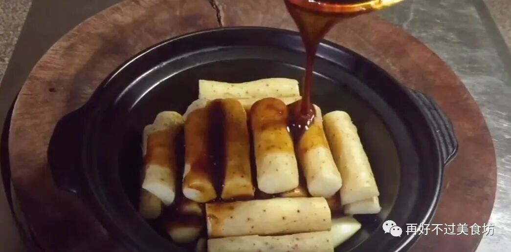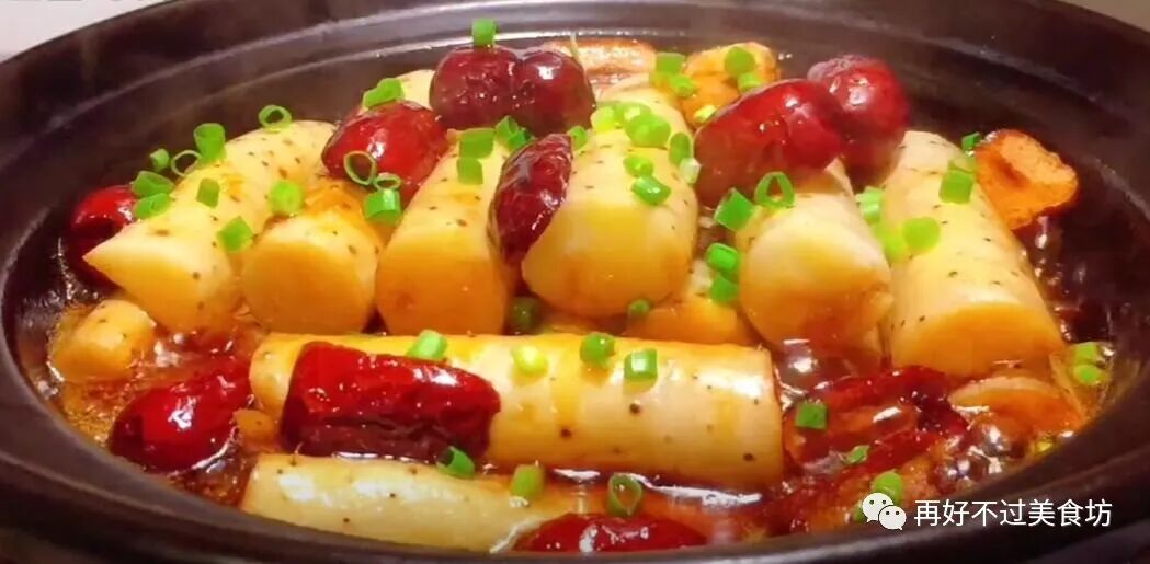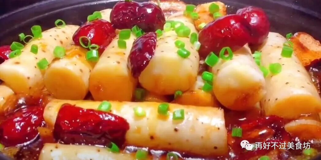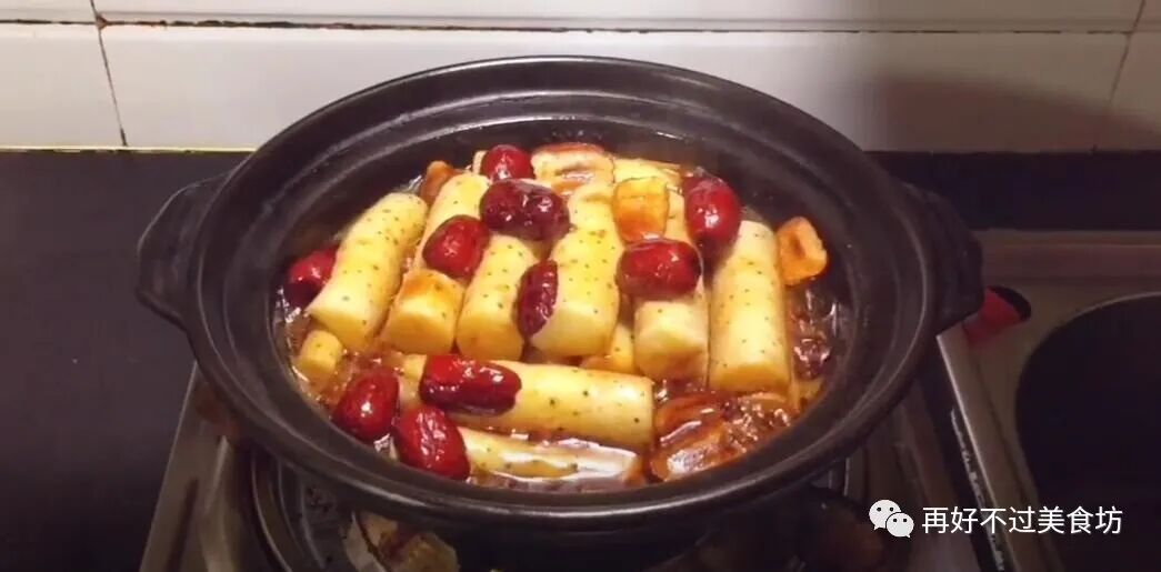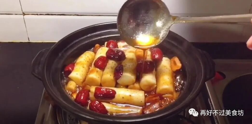 10、期间,再用小勺子反复的舀砂锅里面的汁,淋在铁棍山药上面,这样煮出来会更加的入味,有一点大家要记住,做这道菜是不需要放盐的。
