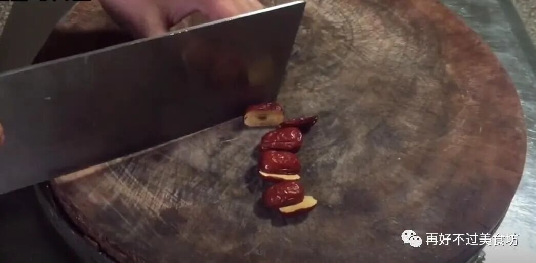 5、准备9颗大红枣,用刀给它一切为二,需要刀偏一点就不会切到枣核,之后放入碗中备用。