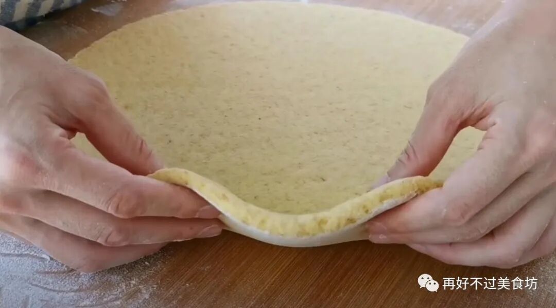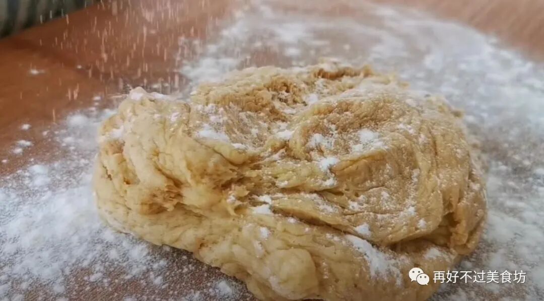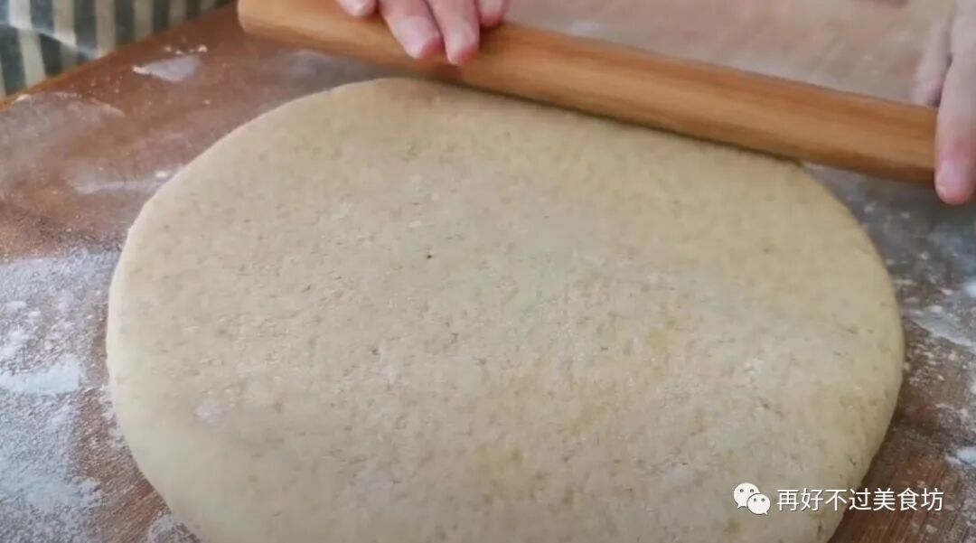 5、再撒点干面粉,把它轻轻拍扁,再取出擀面杖,擀成大饼,0.5厘米左右厚就可以了。