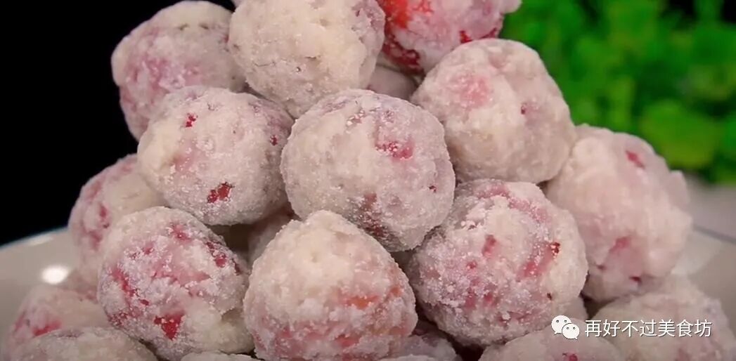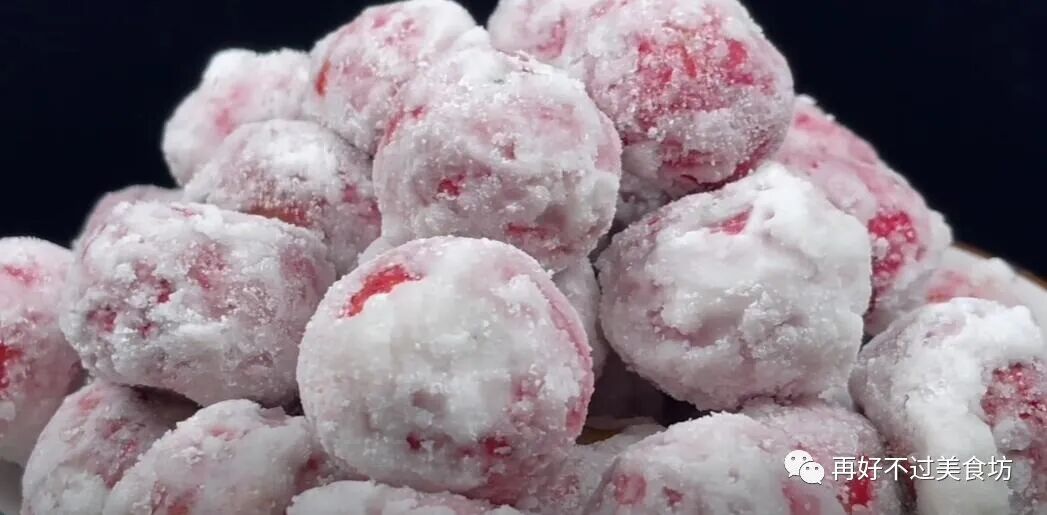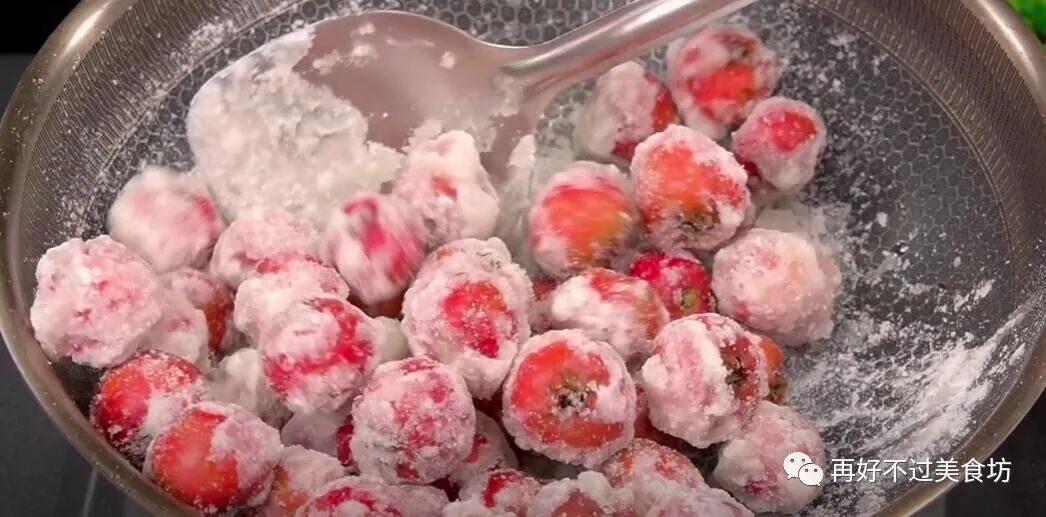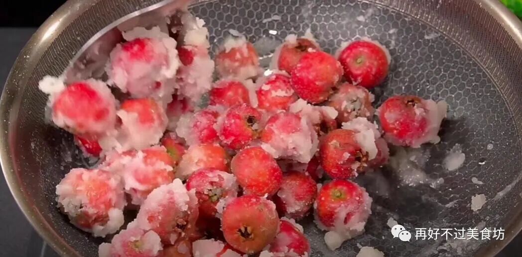 12、随着糖浆温度慢慢地下降,糖浆的颜色是越来越白,直到山楂表面的糖浆变成一层白霜,这就是所谓的挂霜。