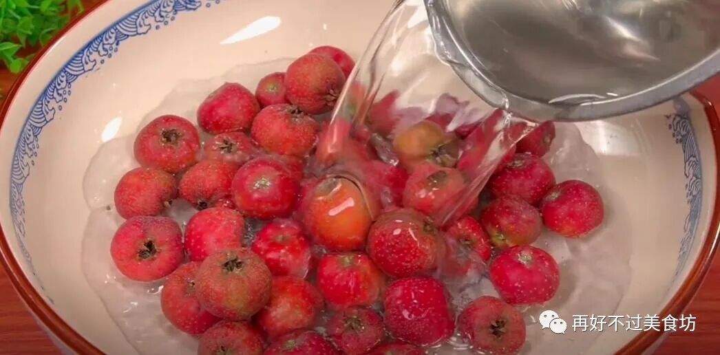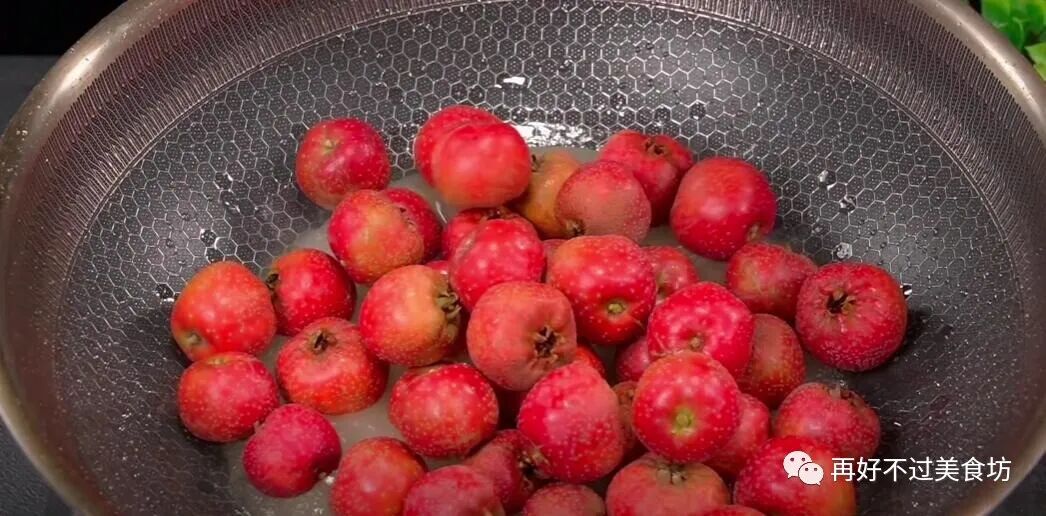 11、大家要注意,倒入山楂时候,一定要等糖浆冷却了再倒,如果太热的话,就会把这个山楂的皮烫掉。