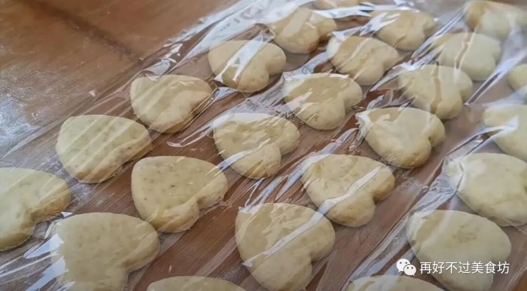 7、把多余的面皮取出来,继续揉成面团,擀成面饼,再压成小饼。