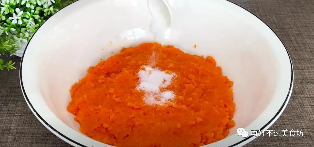 8、往胡萝卜泥里,加入一大勺的食盐,用筷子搅拌均匀,增加底味。