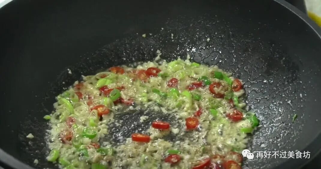 10、锅里油热以后,下入葱花,蒜末,小勺花椒粉,还有几个小米椒,先把香味炒出来。