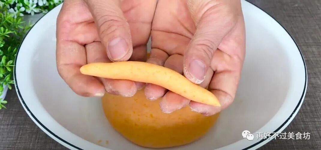 10、然后整理成面团,揉成一个偏软的状态,取适量的面团放在手心,简单揉搓几下,最后搓成两头煎的小面鱼。