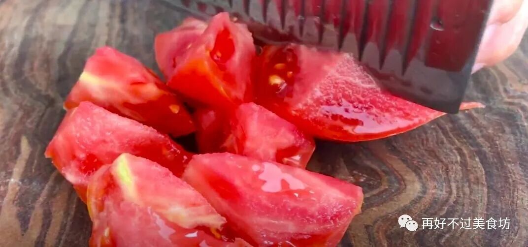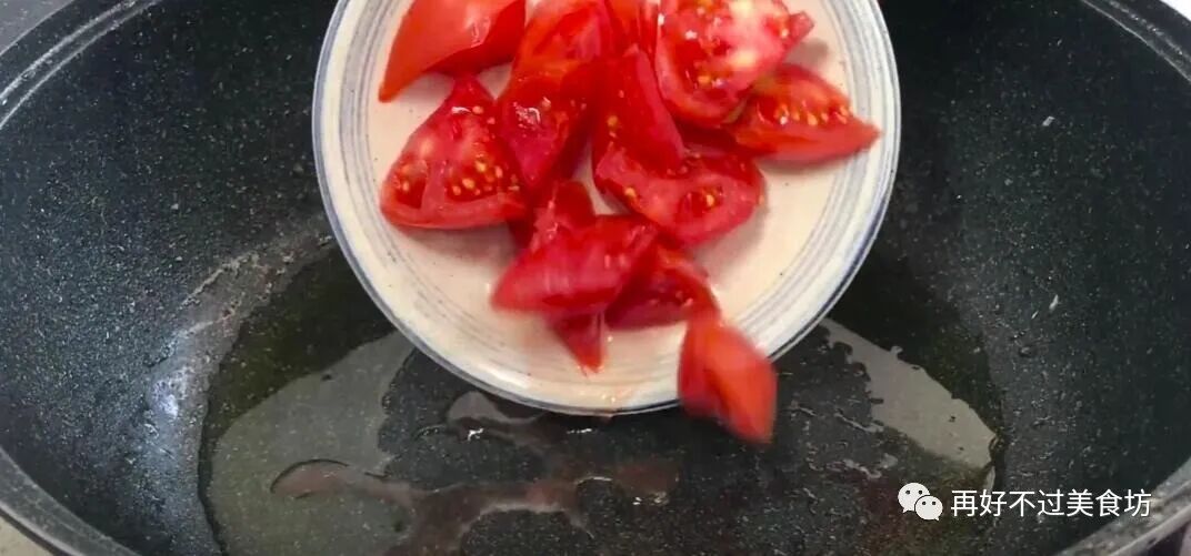 14、再次起锅烧油,倒入西红柿煸炒一下,炒出西红柿的汤汁,尽量把西红柿炒的软烂一点,这样味道会更加的香。