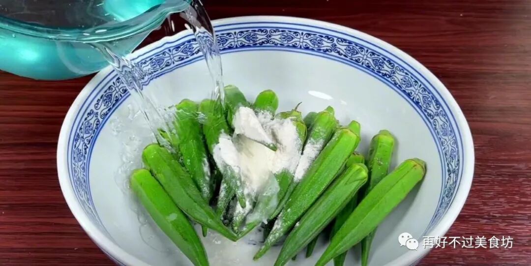 2、将秋葵倒入大碗中,之后加入适量的面粉和清水,给它清洗干净,面粉有着很强的吸附性,能轻松去除秋葵表面上的脏东西。