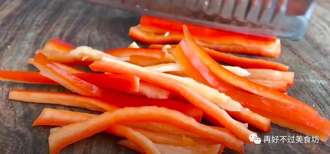 6、一根洗净的青椒切成细丝,半根洗净的红椒也切成细丝。