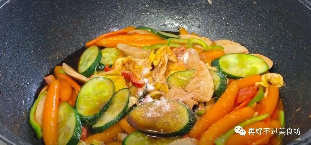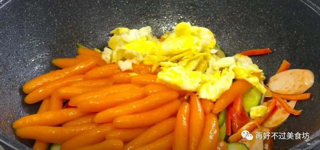 16、下一步倒入黄瓜和青红辣椒,还有火腿肠,继续翻炒均匀,让所有的食材充分的融合,最后倒入小面鱼和鸡蛋,再次翻炒均匀。