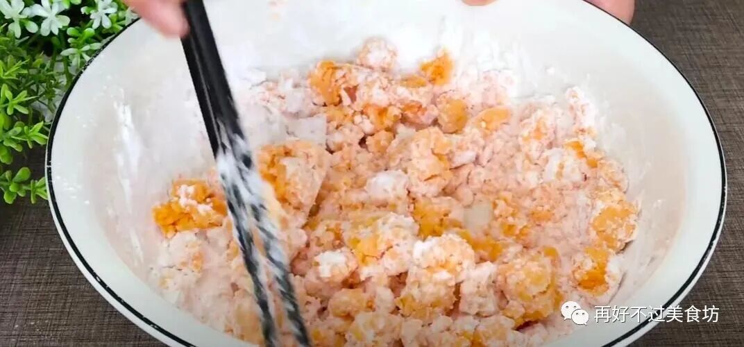 9、再少量多次加入土豆淀粉,边倒边用筷子搅拌均匀,让土豆淀粉和胡萝卜充分的融合,一直搅拌至没有干面粉。
