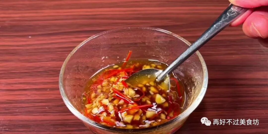 9、接着来点鸡精、芥末、一大勺蒸鱼豉油、少许陈醋、来一点芝麻香油、再加一勺冷开水,用勺子搅拌均匀即可。
