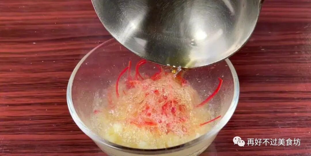 8、现在来调个料汁,碗中加入蒜末、辣椒丝,往里倒入热油,这样能激发它们的香味。