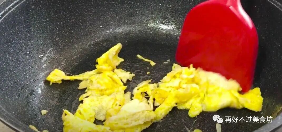 13、接下来,在碗里打入两个鸡蛋,油热后倒入鸡蛋,轻轻推动几下,把鸡蛋炒熟,最后炒成鸡蛋花,先盛出备用。