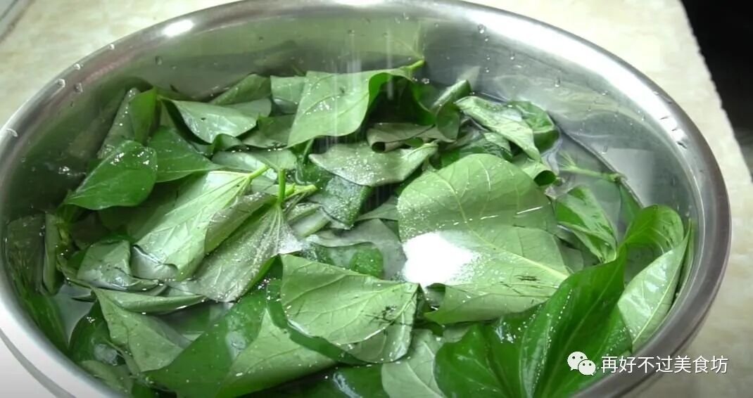 2、先把红薯叶的叶子和茎部分开,装叶子的盆子里加入足量清水,一小勺盐,把红薯叶浸泡10分钟。