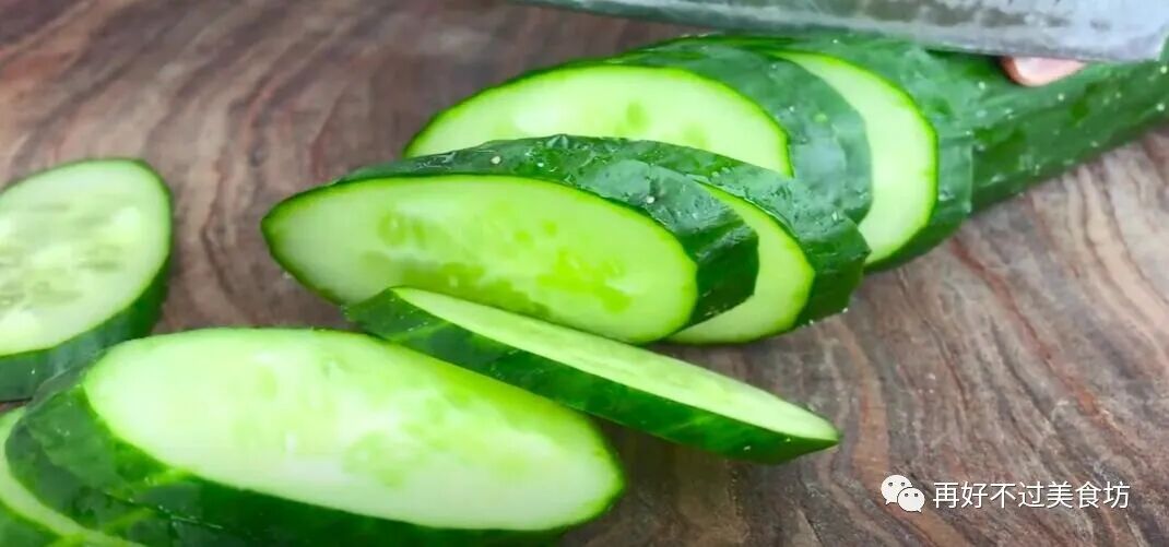 5、接着把半根洗净的黄瓜也切成厚厚的薄片,黄瓜口感非常的清脆,吃起来特别的开胃,切好后装入盘中备用。