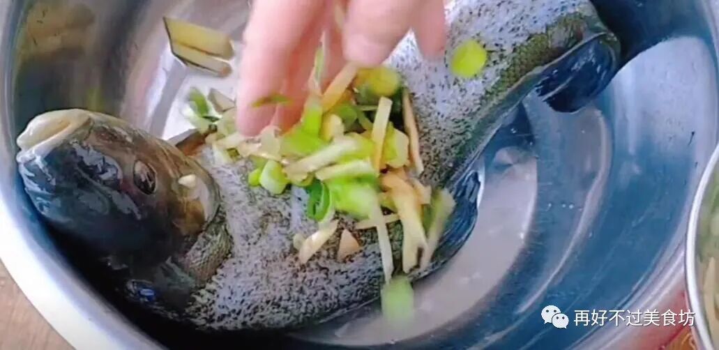5、把一些葱姜蒜塞进鱼肚子,剩下的就放在鱼身上,经过几次的去腥处理,这样蒸出来的鱼鲜嫩入味,不腥不柴。