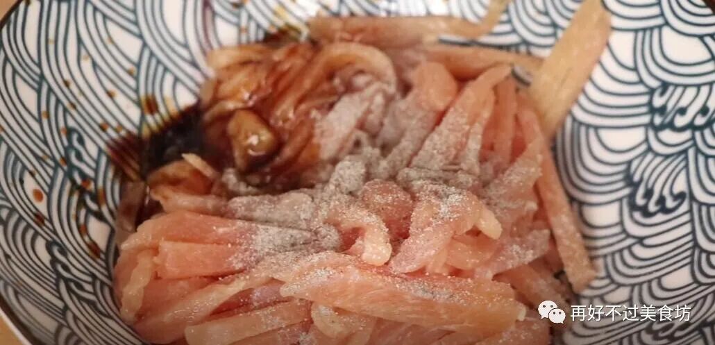 1、首先把鸡胸肉切成薄片,然后全部切成细丝,放入碗中,在里边加上黑胡椒粉、生抽、盐、玉米淀粉和食用油,充分拌匀,放到一旁腌制五分钟。