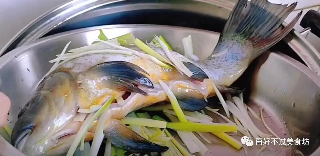 6、放入蒸锅大火蒸制八分钟,这个是两斤重的鱼,时间到,出锅夹去葱姜丝,把盘子里的水倒掉不要,这点水还是有点小味道。