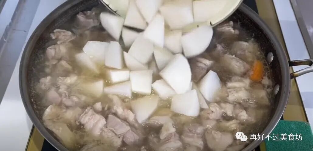 8、准备一个白萝卜,用削皮刀去掉外皮,洗净切成滚刀块,这时把锅里的葱姜捡出来,放入切好的白萝卜,这个时候就可以放入盐调味了。