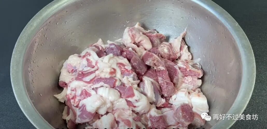 2、洗干净后开始改刀,先把羊肉切成宽条,再切成稍微大一点的小块,全部切好以后放入盆中备用。