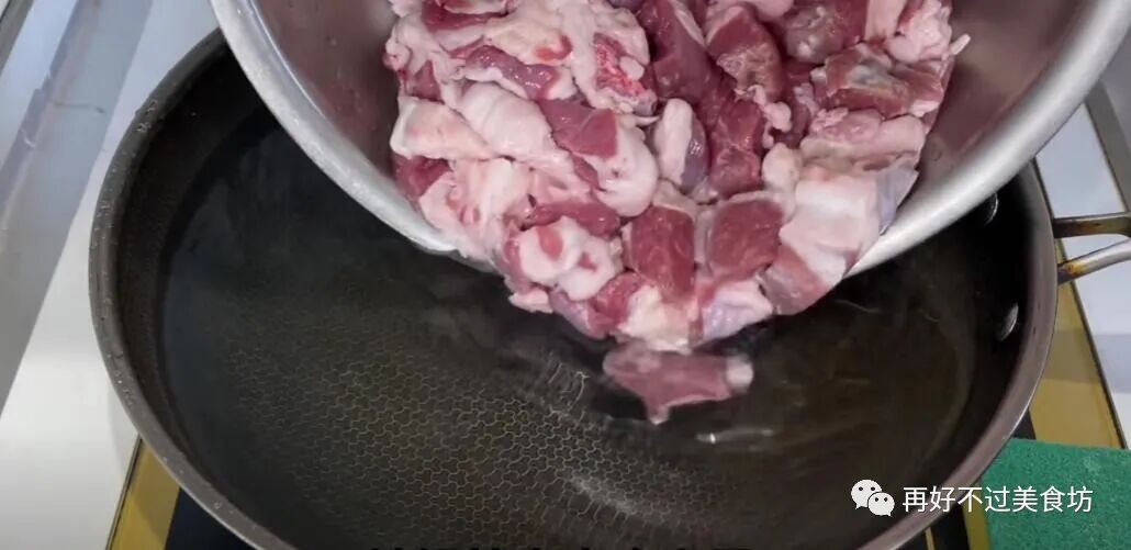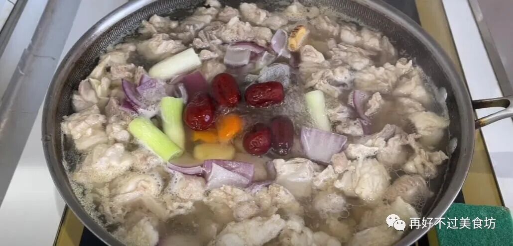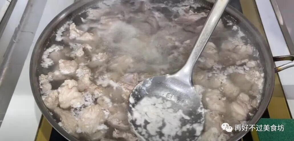 6、切好的羊肉冷水放入锅中,开大火烧开锅,开锅以后撇掉浮沫,新鲜的羊肉不用焯水,但是浮沫一定要撇干净,这样做出来汤才会够清凉,够鲜美。