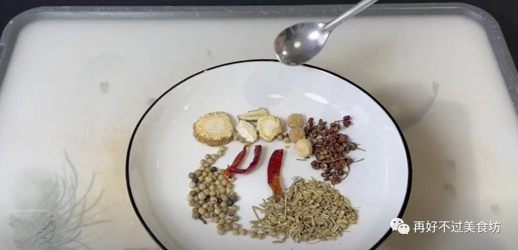 5、把香料放到料包中,加入清水稍微浸泡一会,去除灰尘和一些药料味,起锅多加一些清水,水一次性加足,中途不要加水。