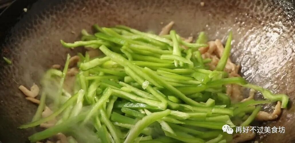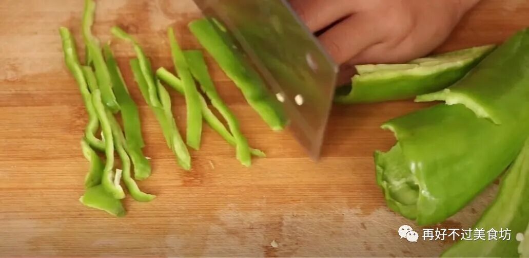 2、青椒清洗干净后,把辣椒籽去掉,这样口感才会更好,然后把它切成丝,这个辣椒丝,一定要多切上一点,好吃,营养超下饭。