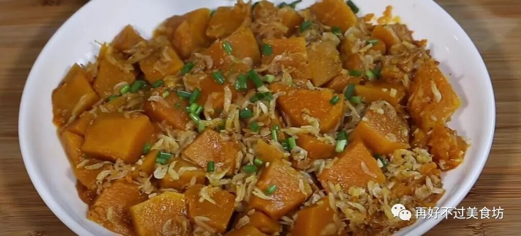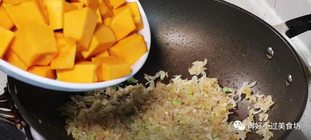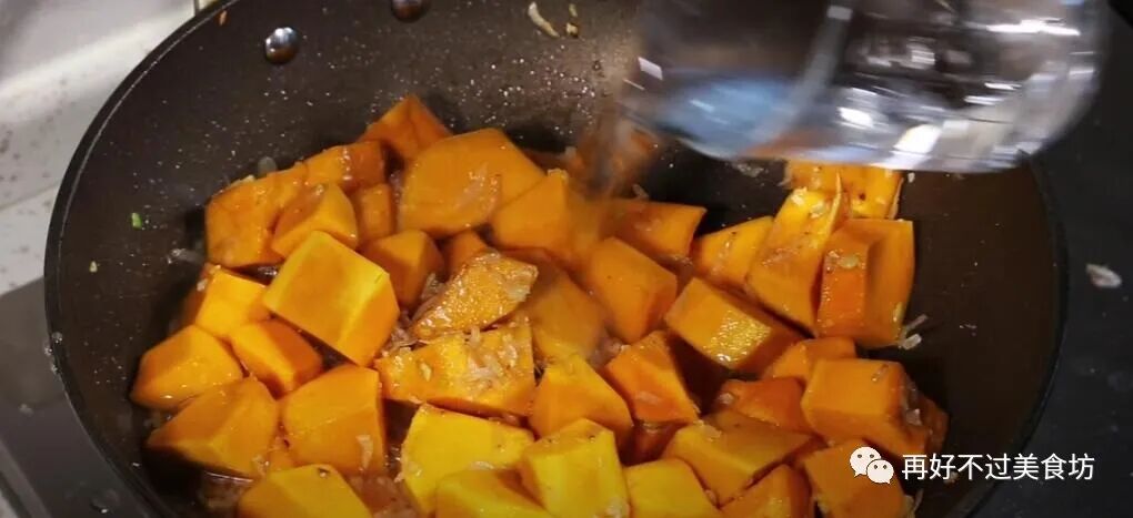 4、现在把南瓜加进去,均匀加料酒调味,虾皮本身有点咸的,我们少加一点盐,加入清水,清水没过南瓜就可以了,盖上锅盖煮开以后6到8分钟就可以了。