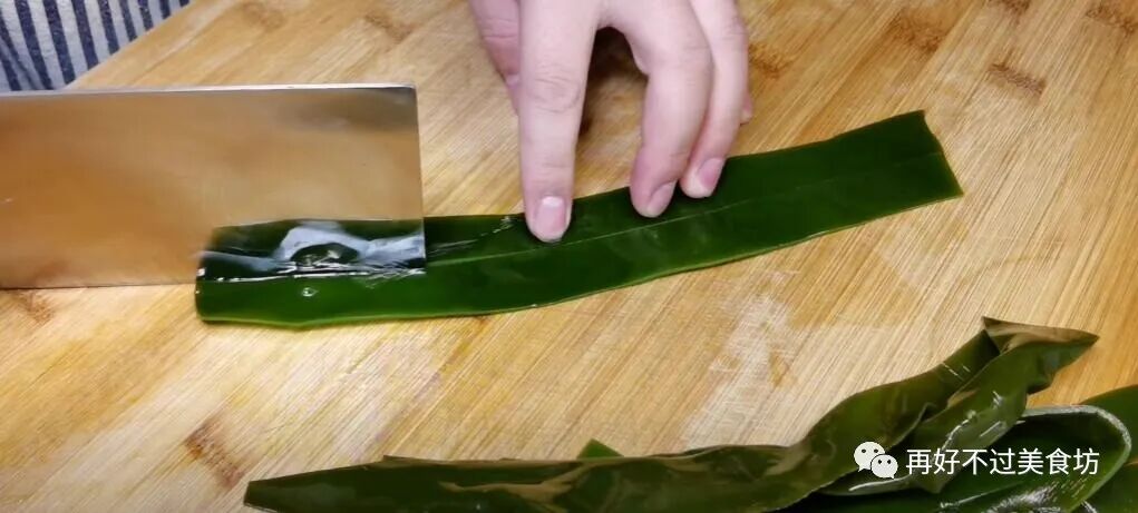 2、准备一些海带,划成宽条,再把海带换成一个结,做成海带结,全部处理好放一起备用。再准备生姜一块儿切姜片,小葱一根切成葱花,切好放一旁备用。
